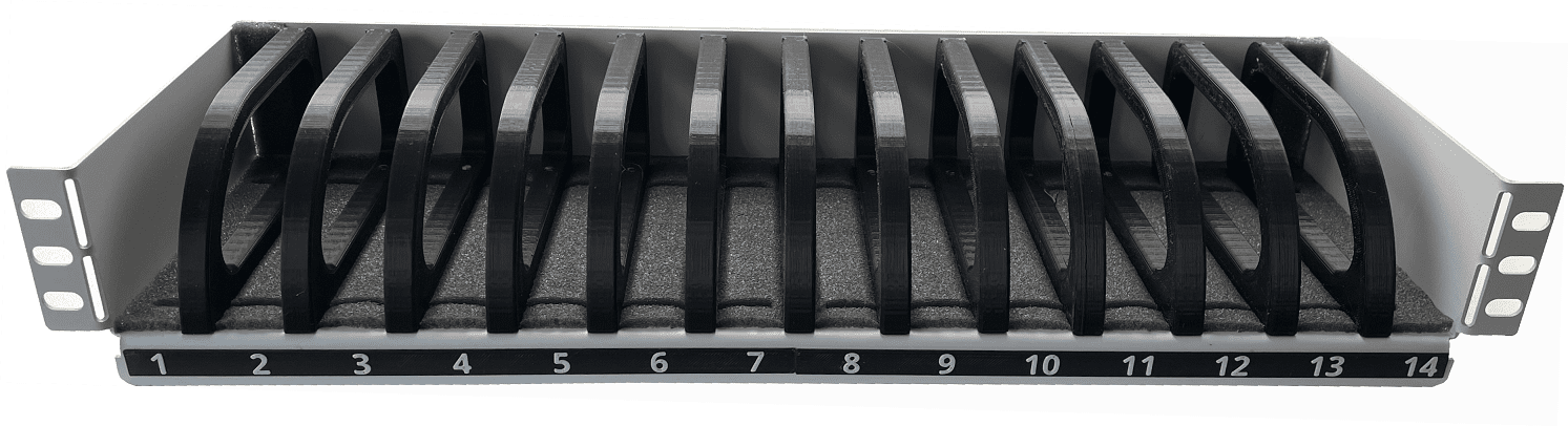 Mit unserem 19 Zoll Handyträger schaffen Sie Ordnung und Sicherheit für Smartphones und Handys – ideal für Schulen, Universitäten, Büros oder IT-Abteilungen. Diese smarte Ablage bietet Platz für bis zu 14 Geräte und lässt sich platzsparend in jedem genormten 19"-Wand- oder Standschrank integrieren. So bleiben Ihre Smartphones stets geordnet, geschützt und auf Wunsch sogar direkt während der Lagerung geladen.