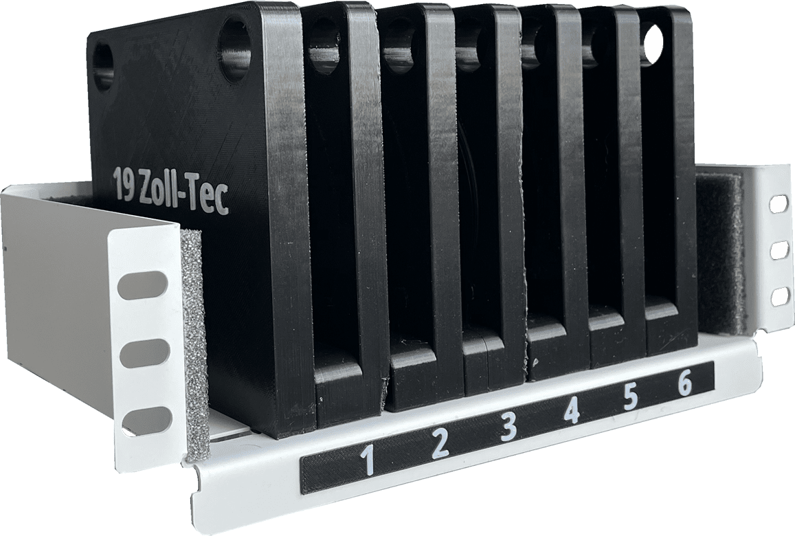 Es ermöglicht die sichere Aufbewahrung und das gleichzeitige Laden von 6 Smartphones – sauber organisiert, übersichtlich und platzsparend in einem standardisierten 10"-Schrank.